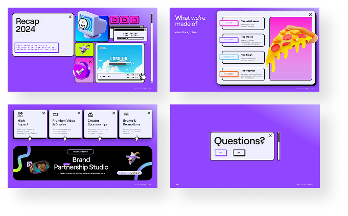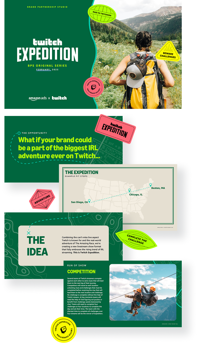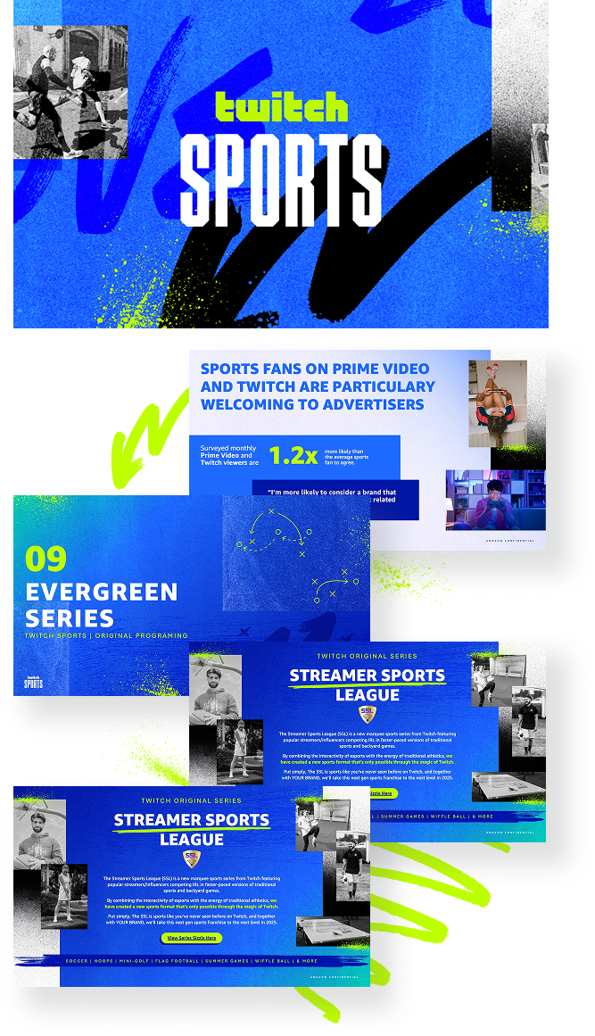 The Twitch Brand Partnership Studio team needed a versatile creative partner to help them deliver a high volume of assets while upleveling quality and new visual systems, extending the Twitch brand into a wide range of new content categories, including sports and adventure TV.